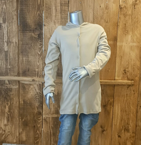 Zand hoodie met drukknoopjes en zwart bedrukte tekst 'kleine baas' op achterkant.